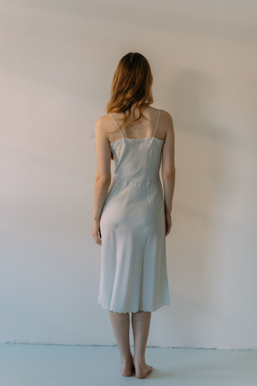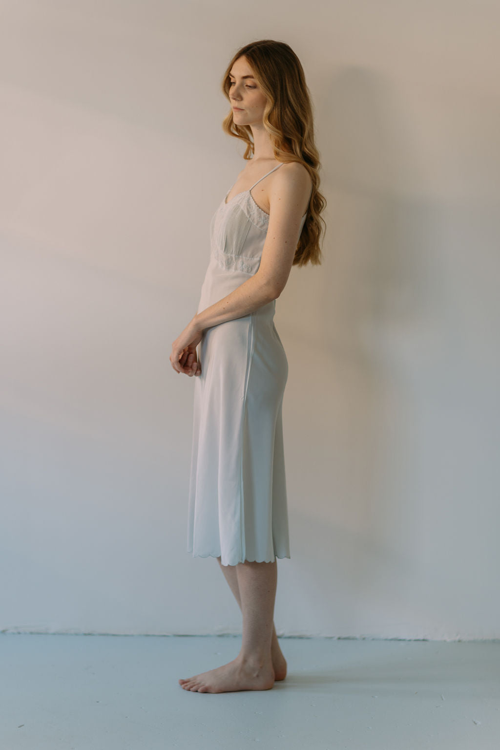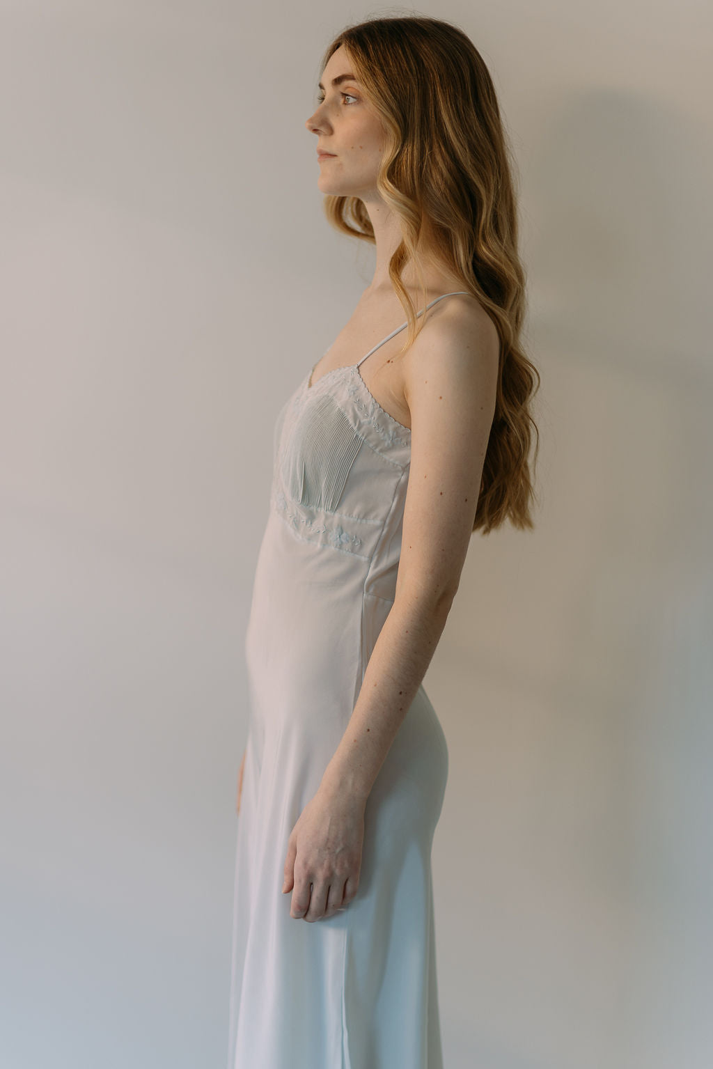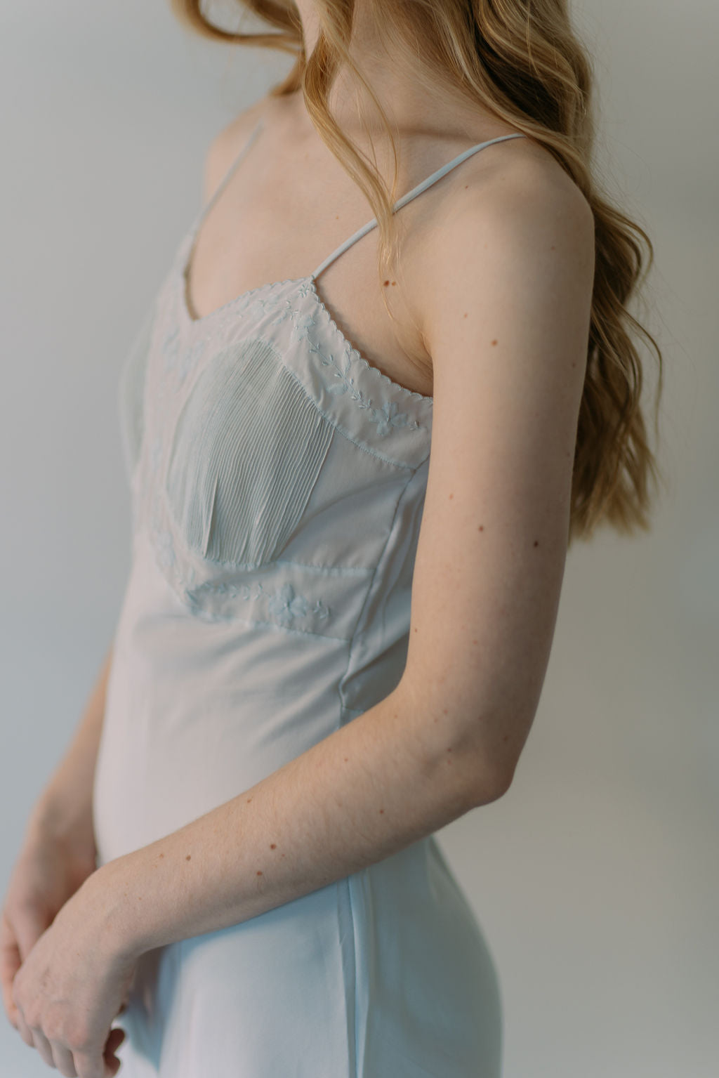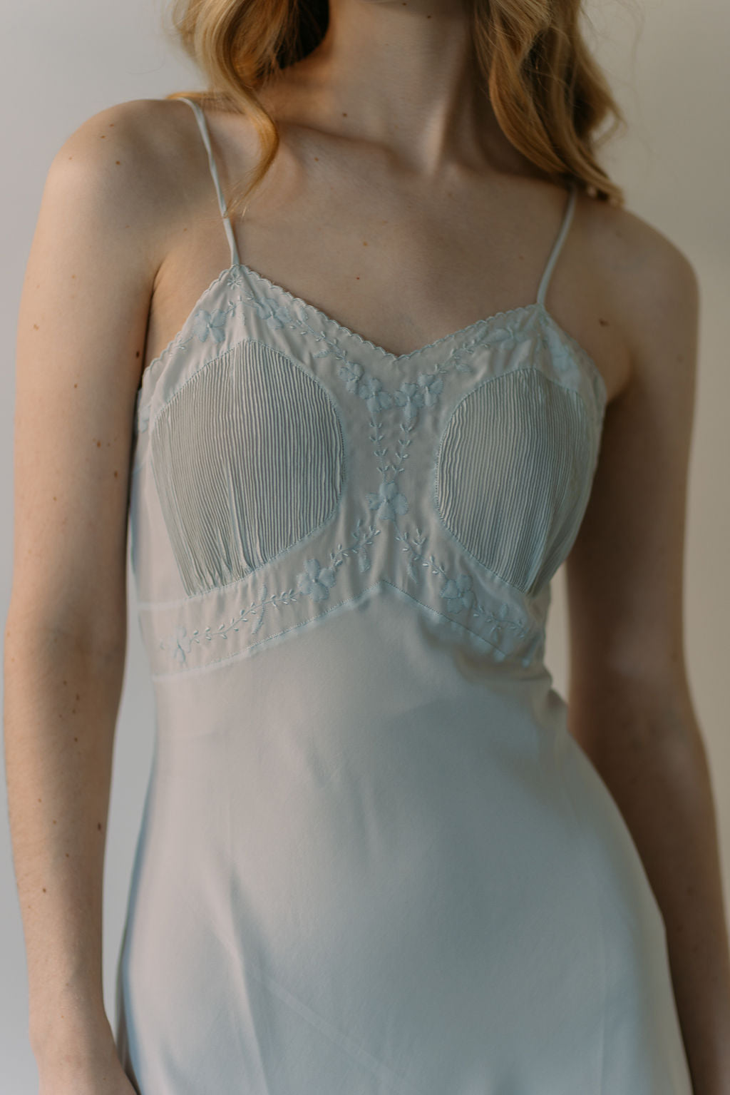 A rare early 1930s pale blue silk half slip with scalloped hem and accordian pleated bust with floral embroidery. Sourced in france.