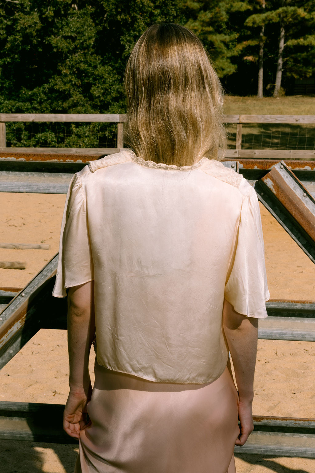 a buttery silk and lace bed jacket c. 1920s from England. Lace front and collar, silk tie and silk sleeves and back.