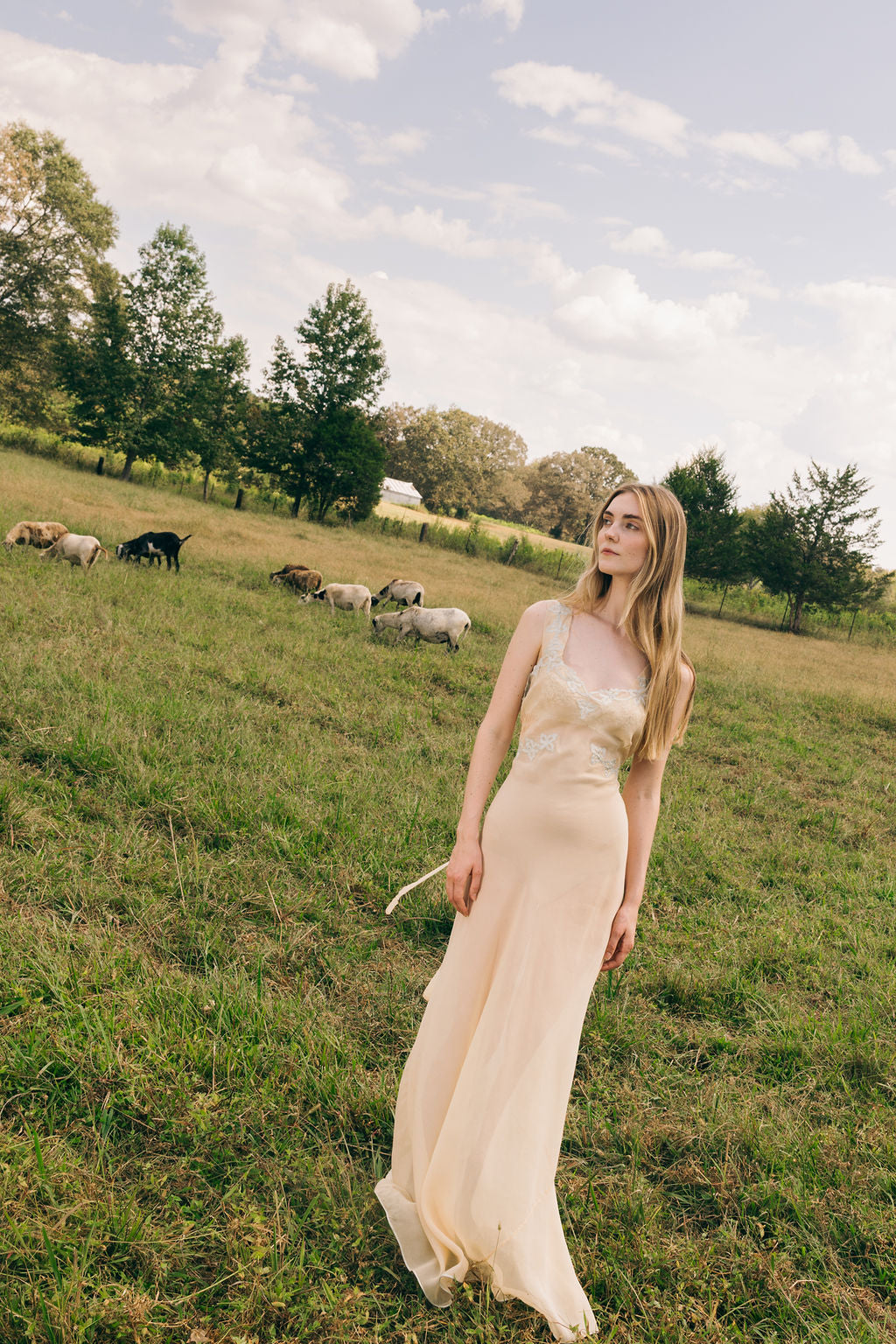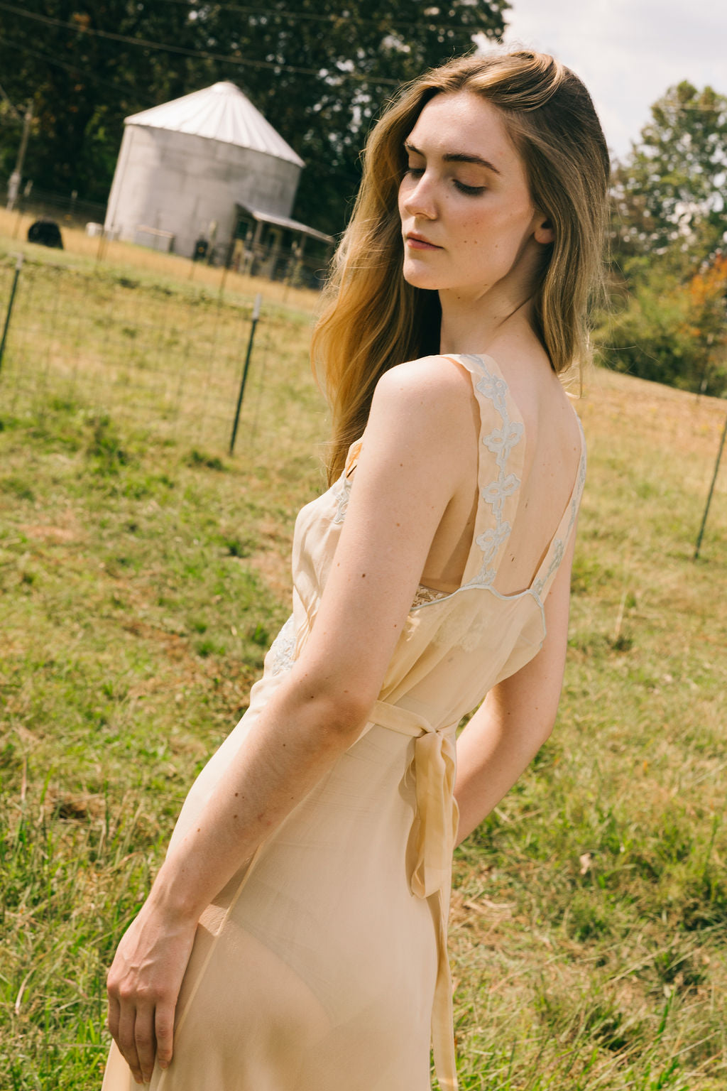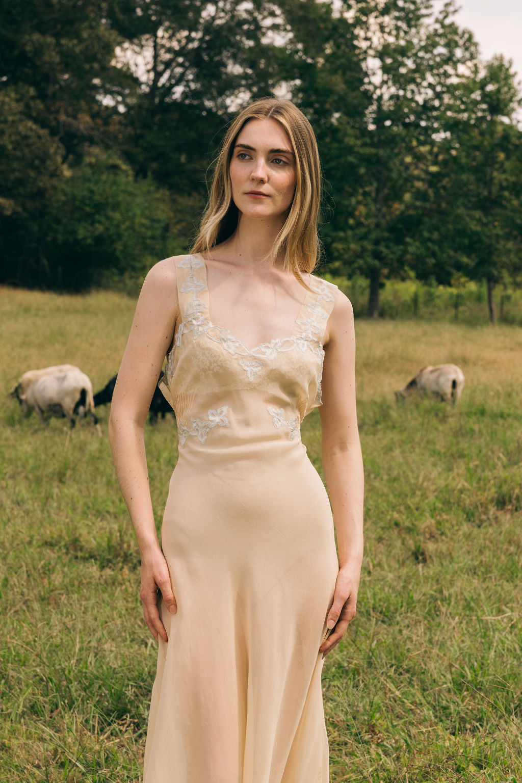 Warm cream bias cut semi sheer silk crepe nightgown with blue satin applique. Self tie belt.
