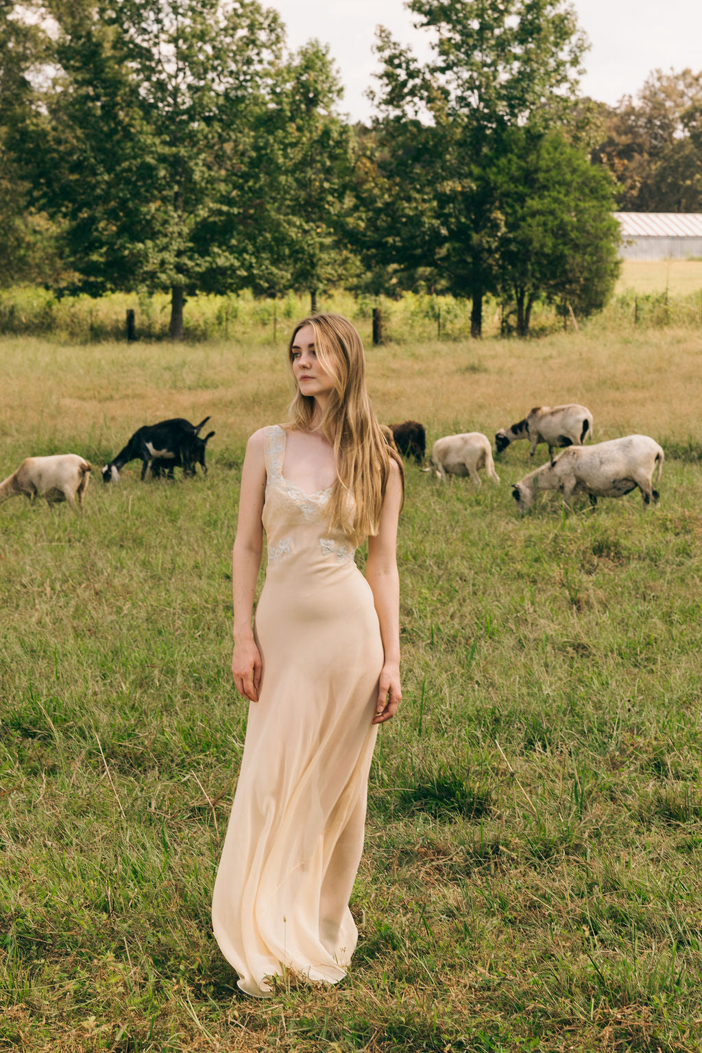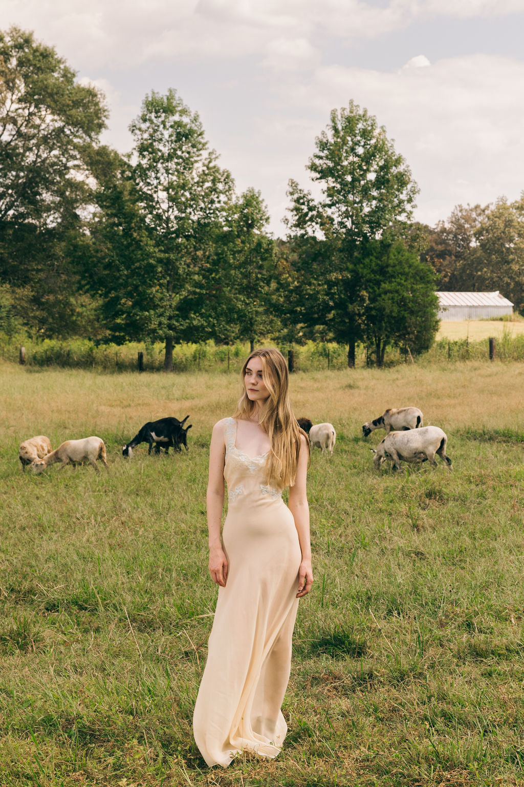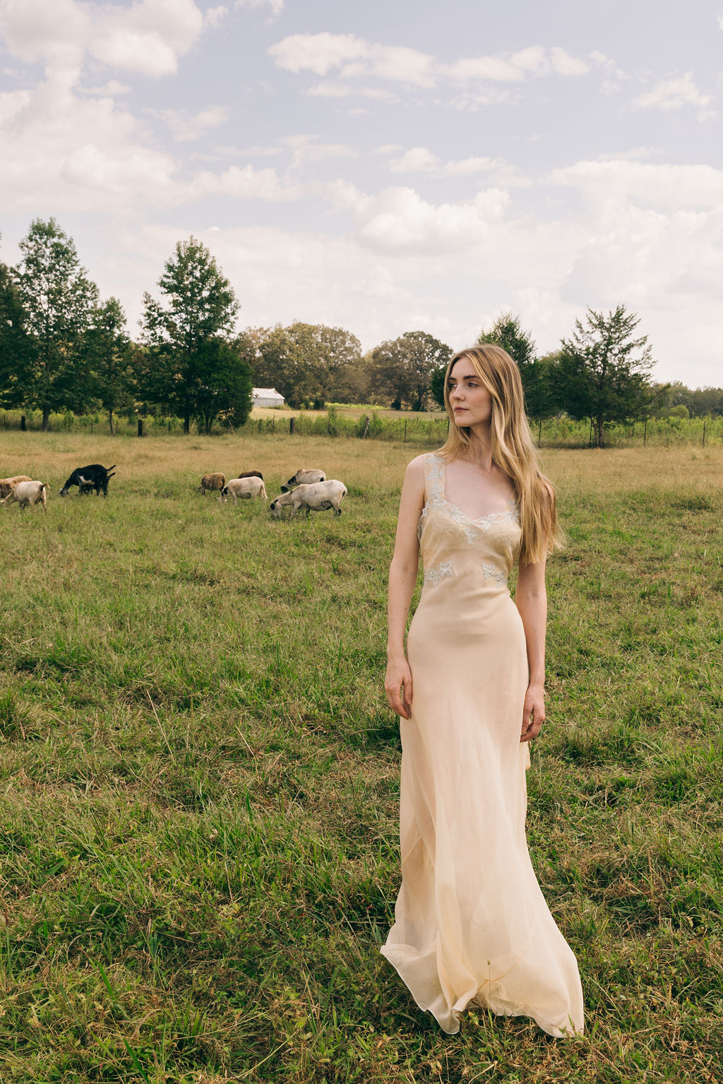 Warm cream bias cut semi sheer silk crepe nightgown with blue satin applique. Self tie belt.