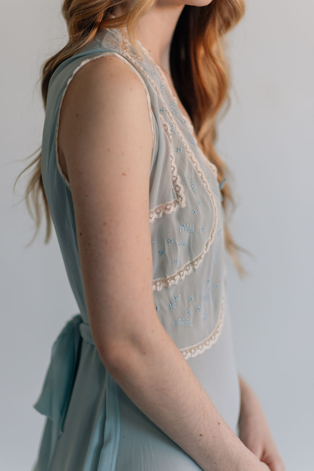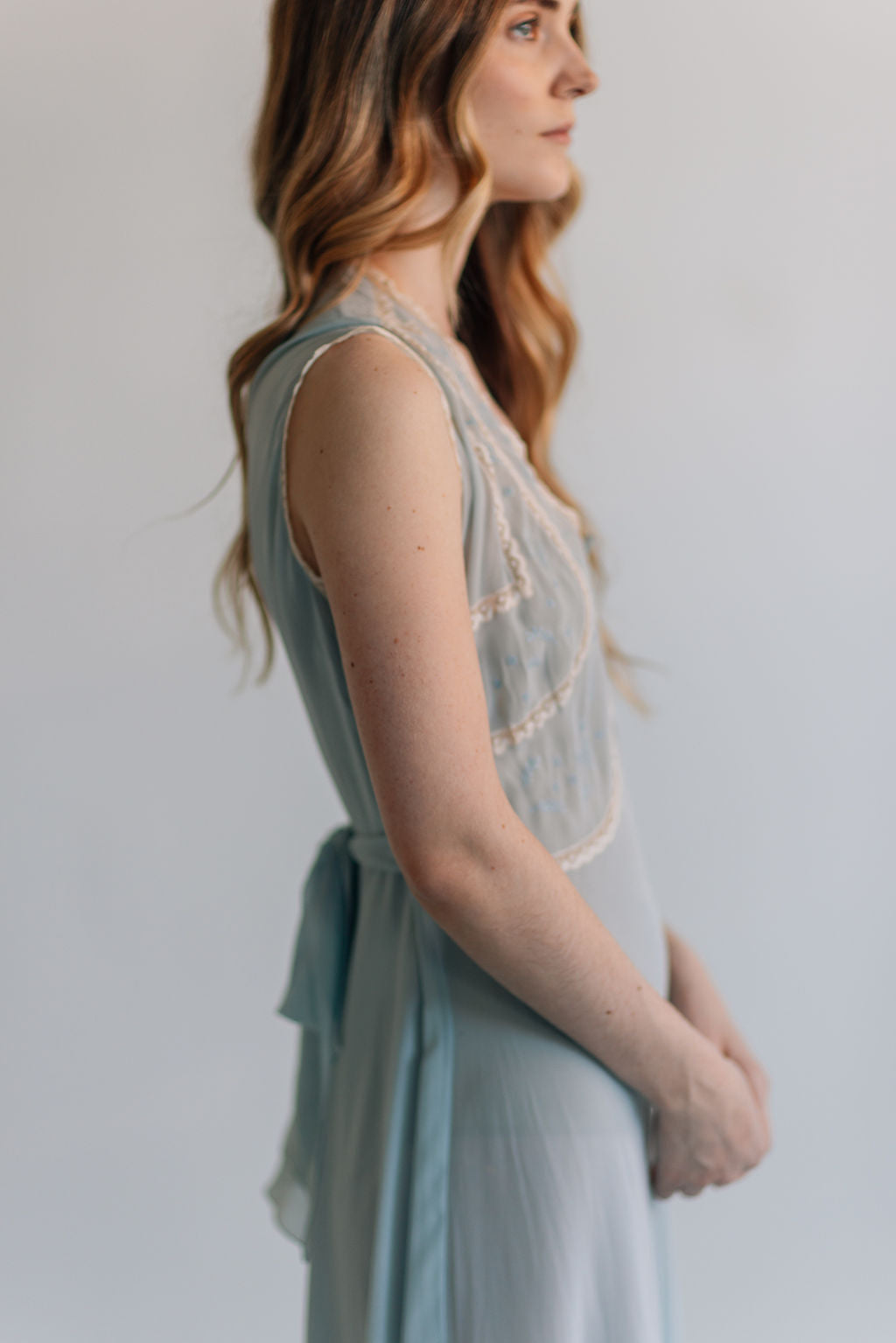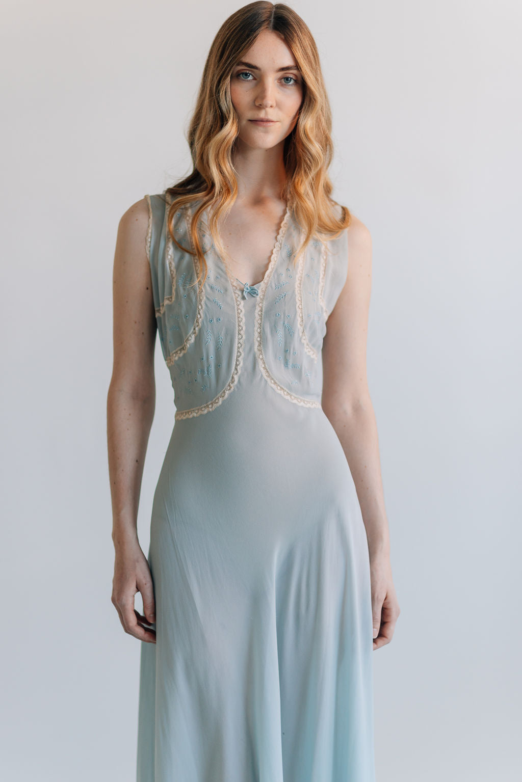 A rare soft blue silk crepe chiffon full length nightgown from Paris. Lace, bows and florals on bustline. Self tie. Light airy silk chiffon, could be worn during the day or for a wedding or event. A rare wearable art deco piece of history from Europe.
