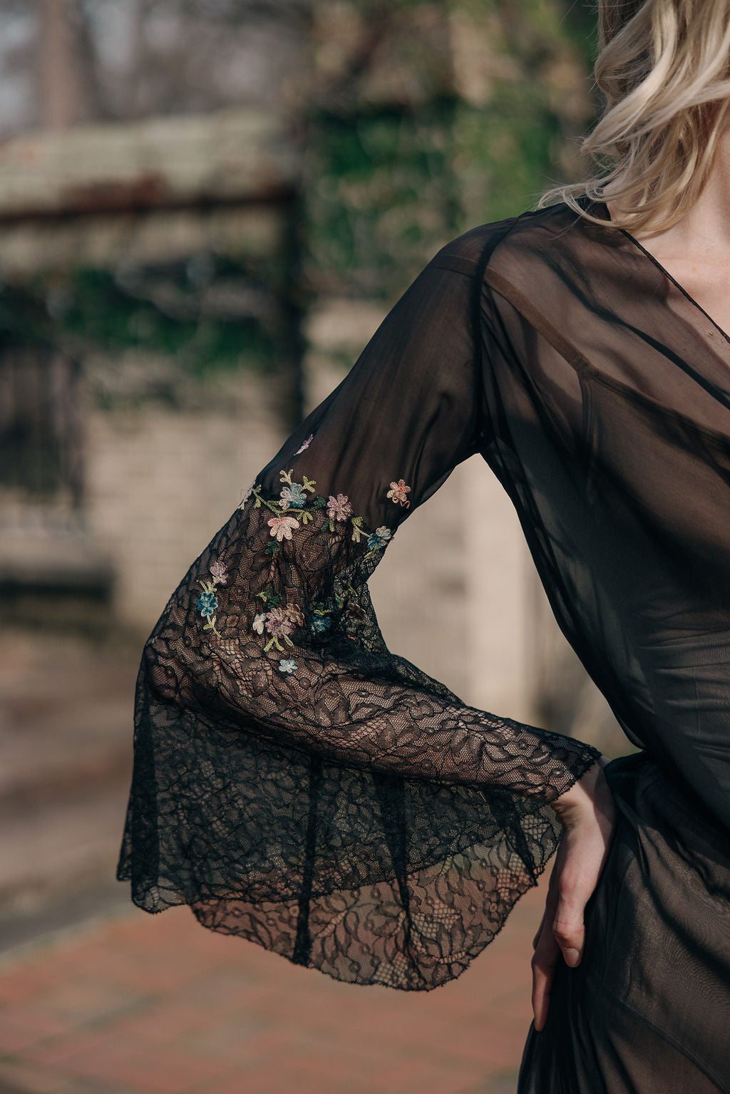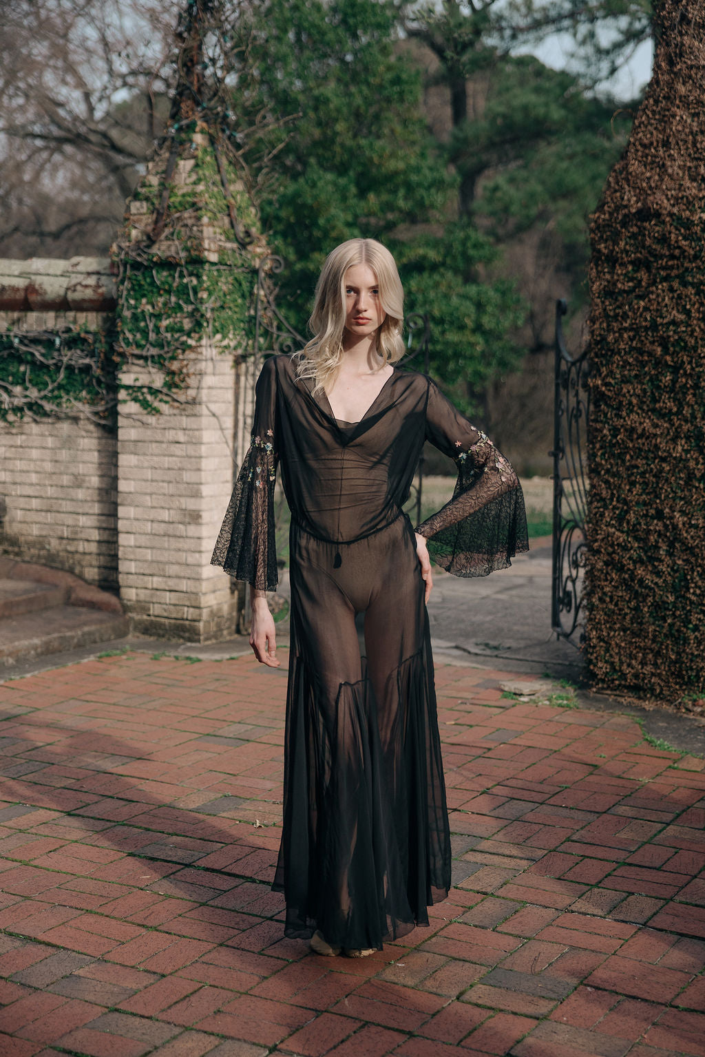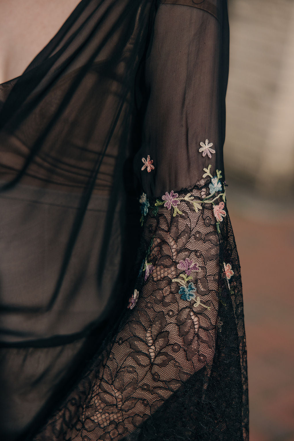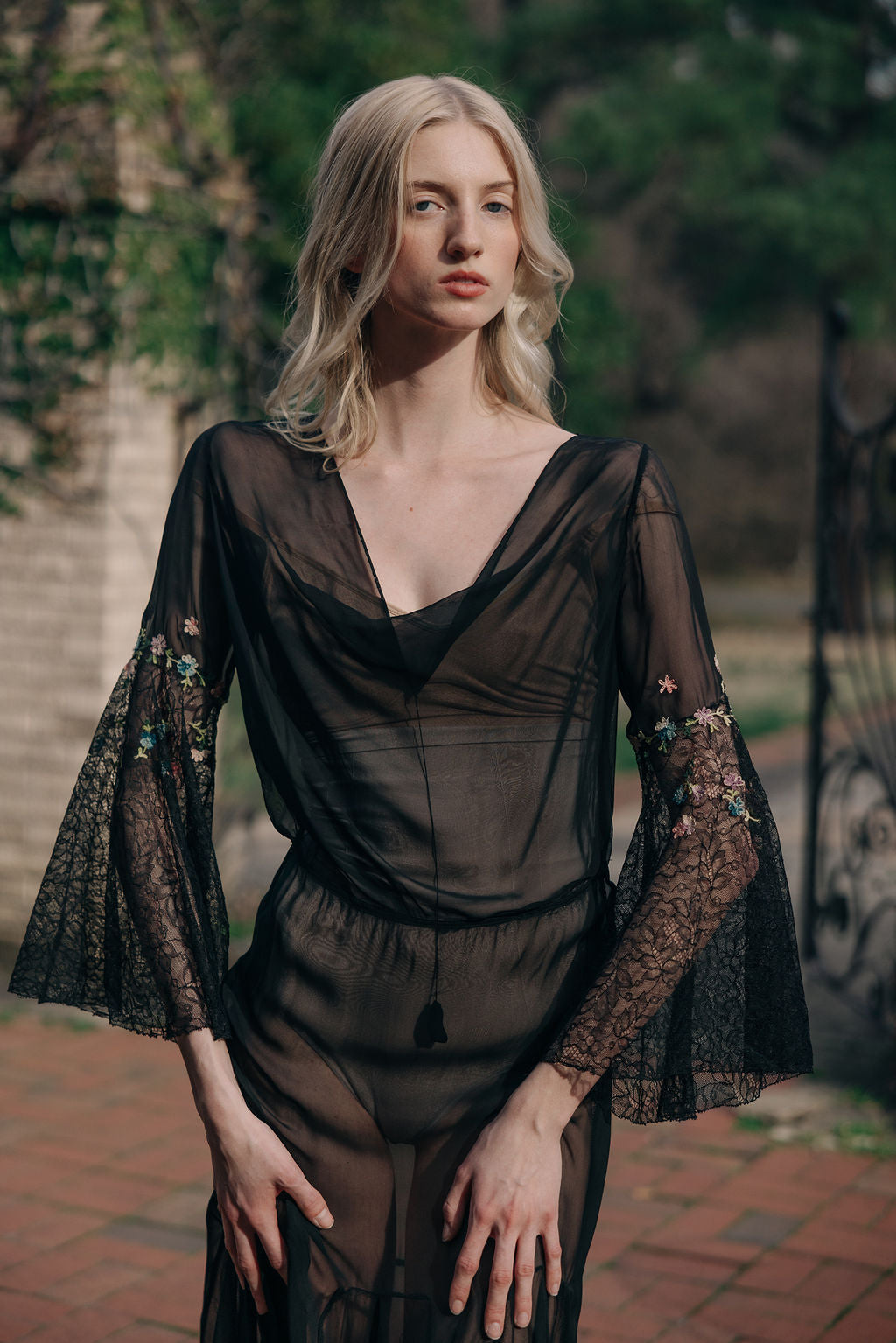 Antique 1930s semi sheer black silk chiffon and lace floral chainstitched gown. Bell sleeves with floral chain stitched embroidered flowers.