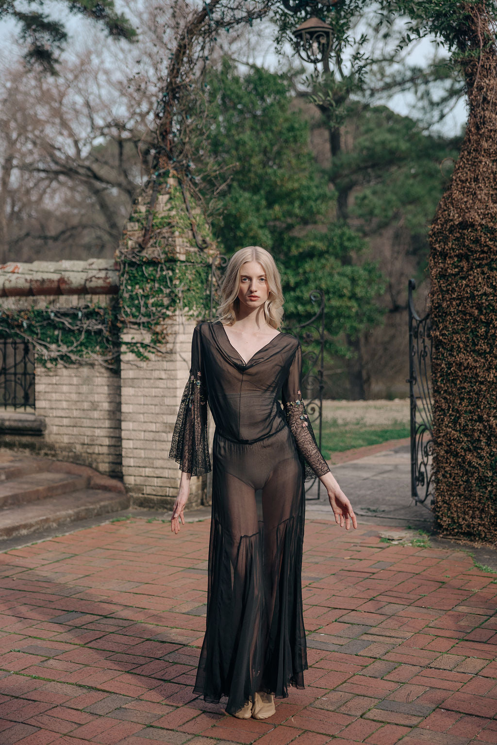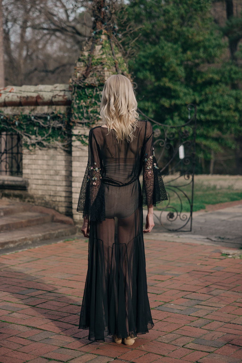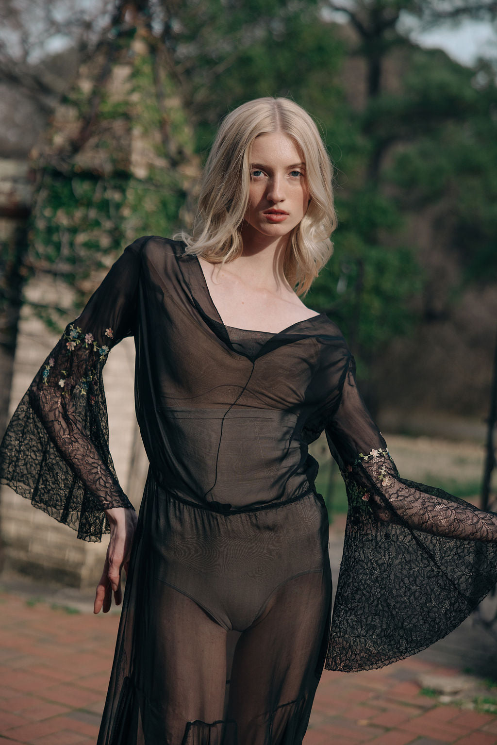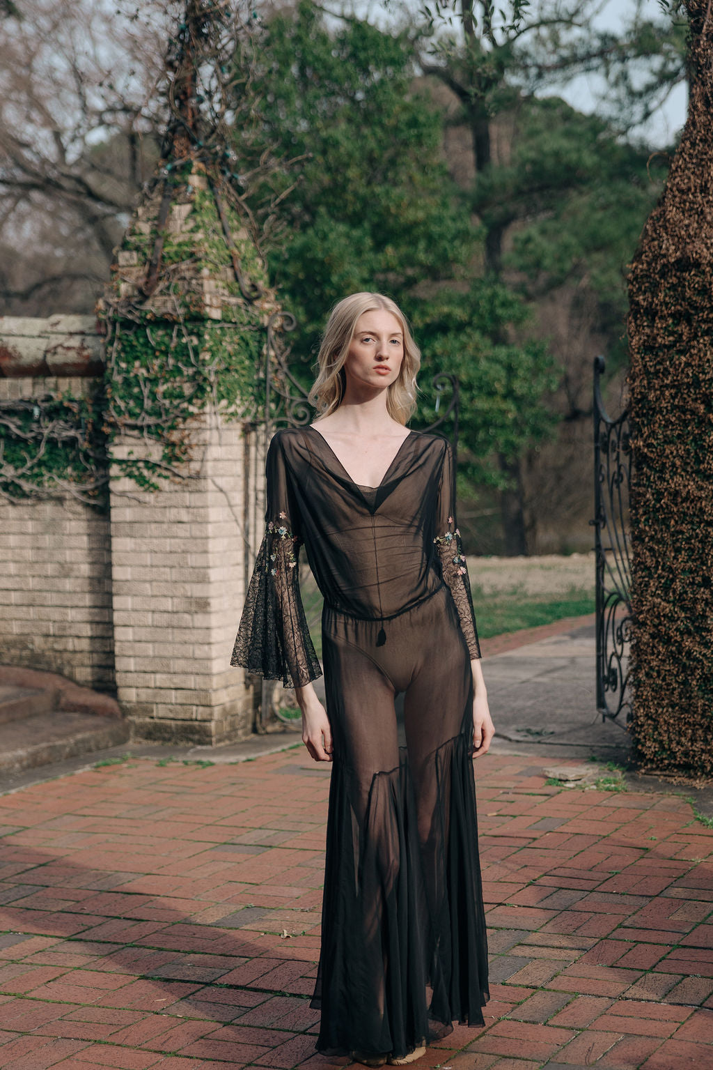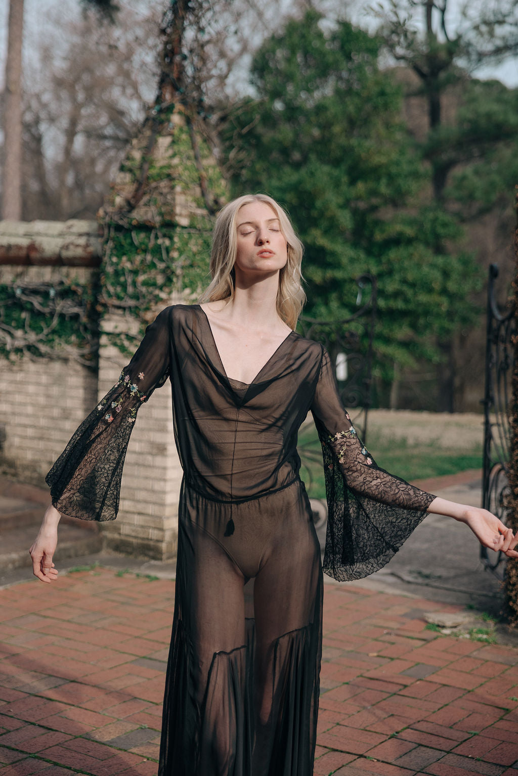 Antique 1930s semi sheer black silk chiffon and lace floral chainstitched gown. Bell sleeves with floral chain stitched embroidered flowers.
