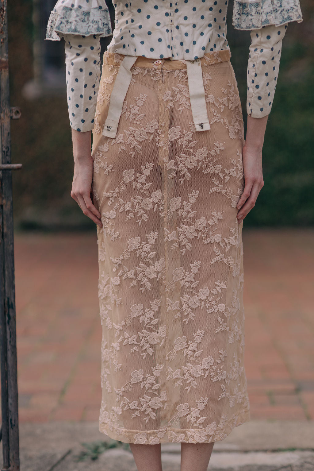 Vintage 1990s Dolce and Gabbana nude lace on net skirt. Fixed waistband, zip and button.