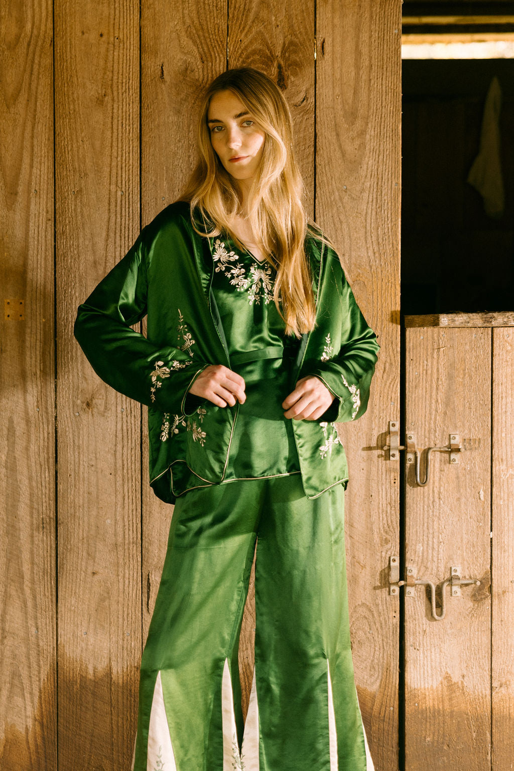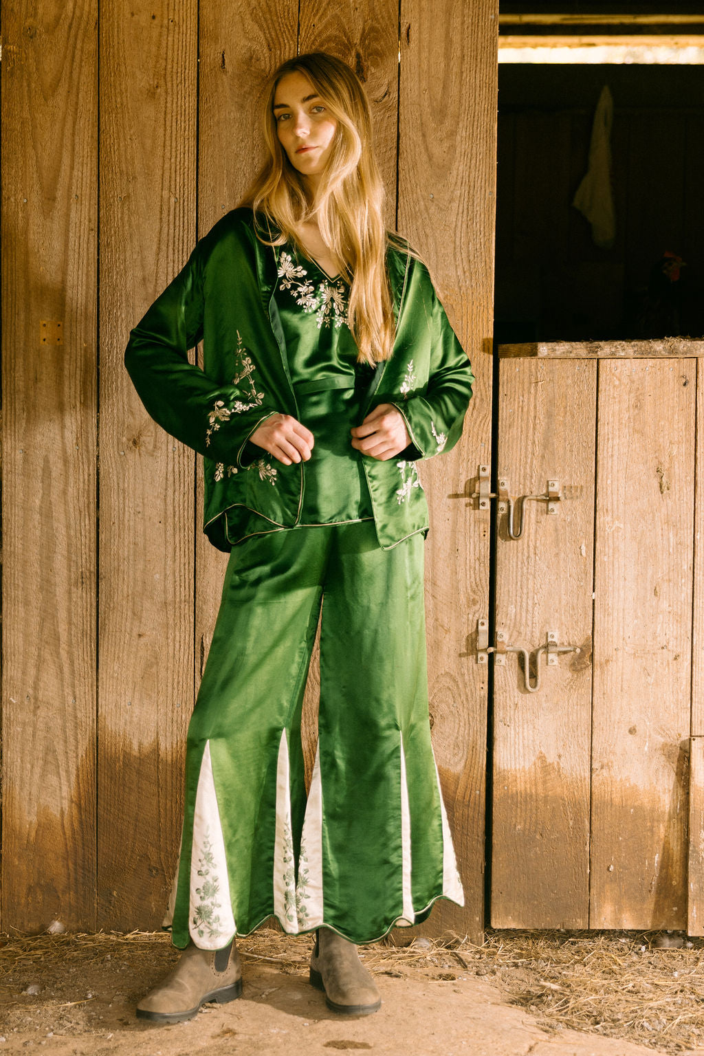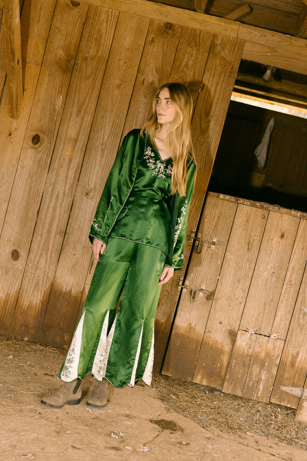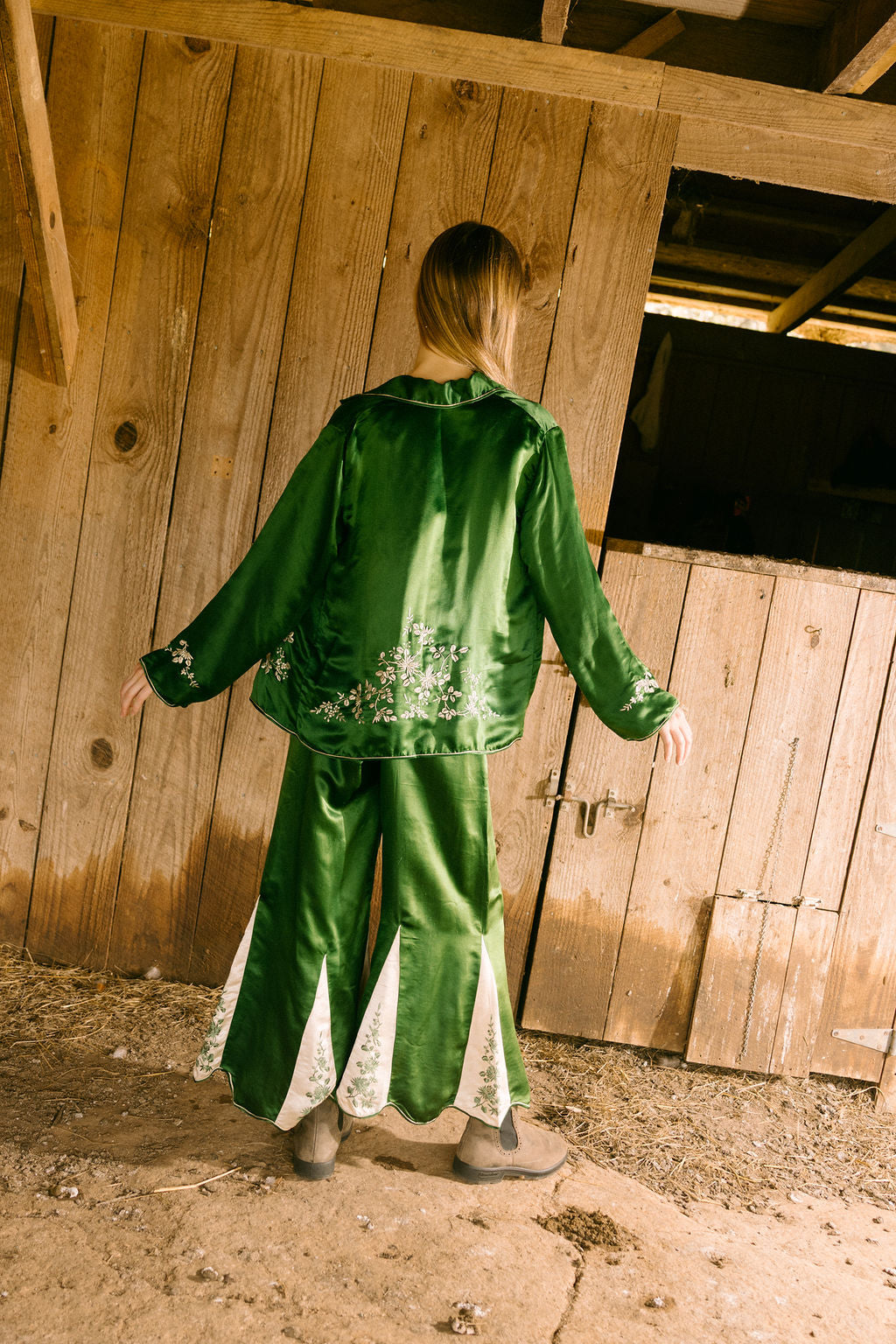 RARE c. 1920s  PJ set in a sought after emerald green silk. Chinoiserie inspired / Asian origin. Pants, blouse, belt, and jacket. Green with ivory embroidery. Pants flare and have an elastic waist which we added.