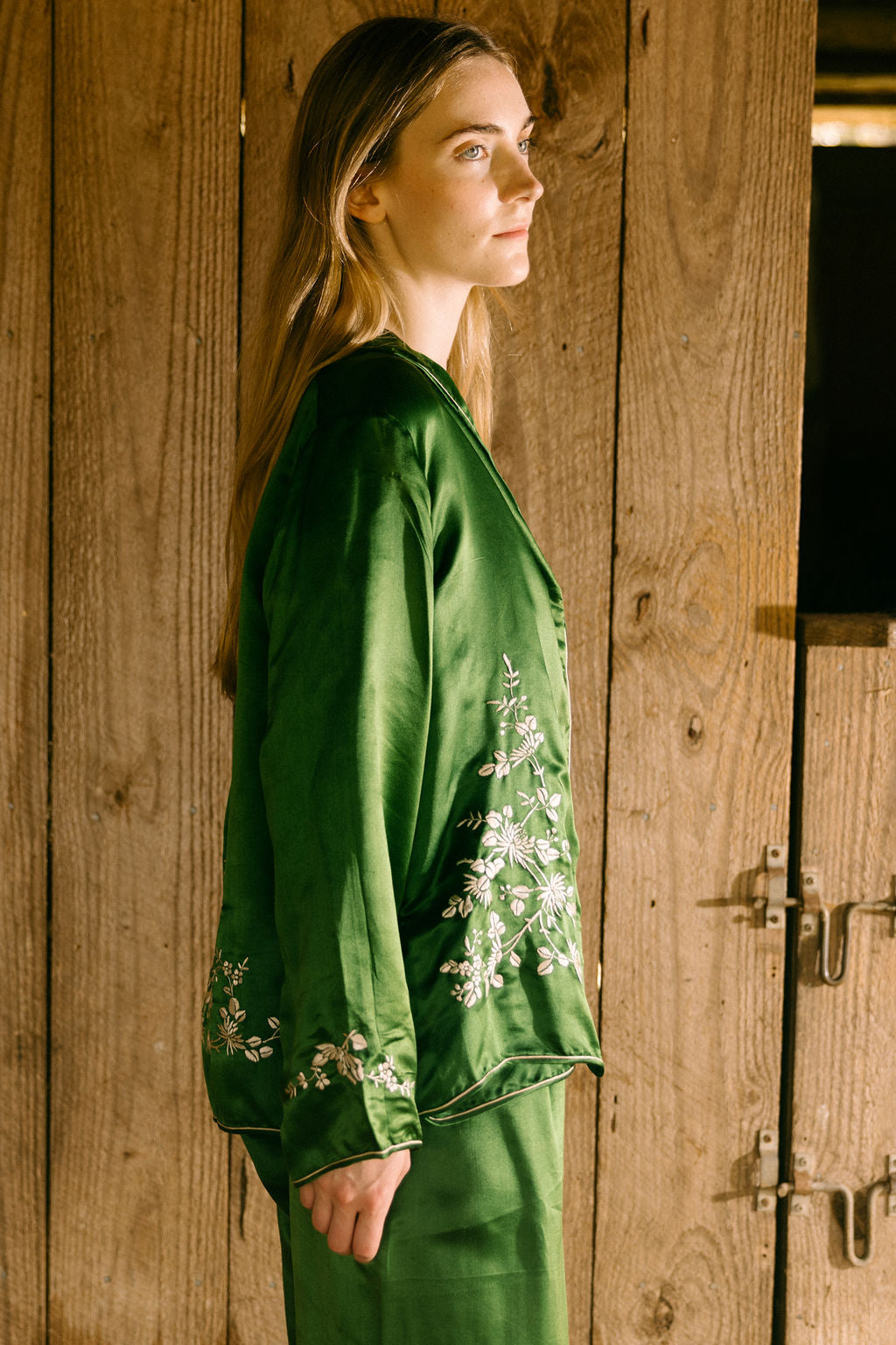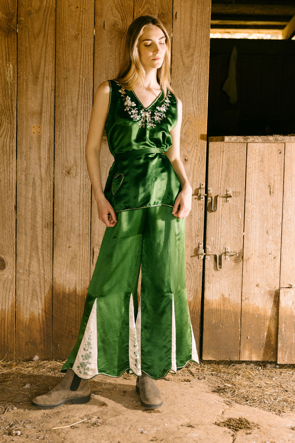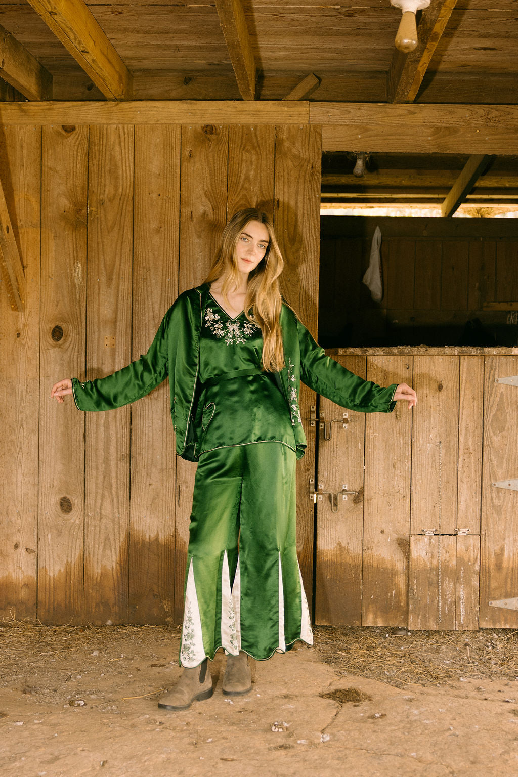 RARE c. 1920s  PJ set in a sought after emerald green silk. Chinoiserie inspired / Asian origin. Pants, blouse, belt, and jacket. Green with ivory embroidery. Pants flare and have an elastic waist which we added.