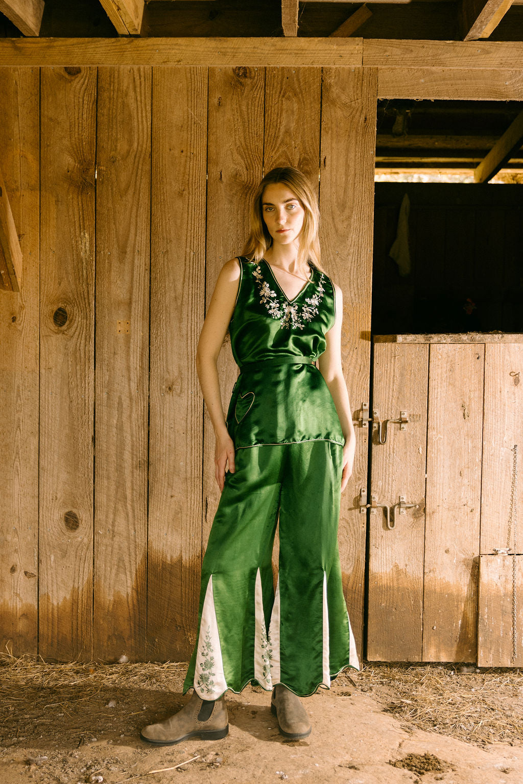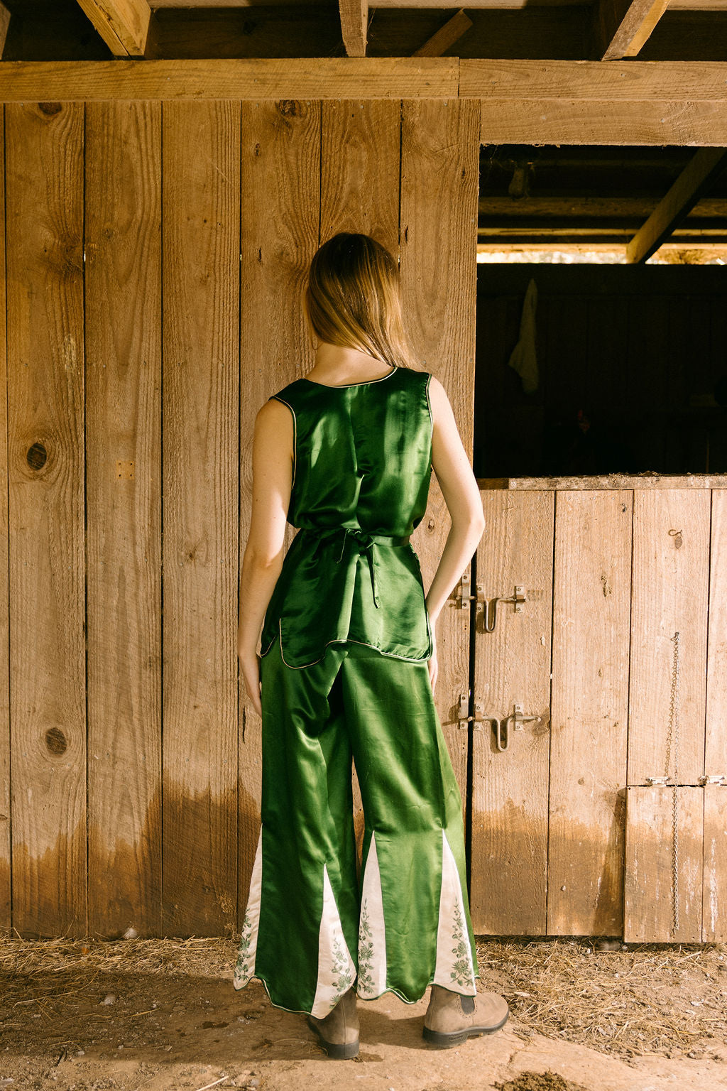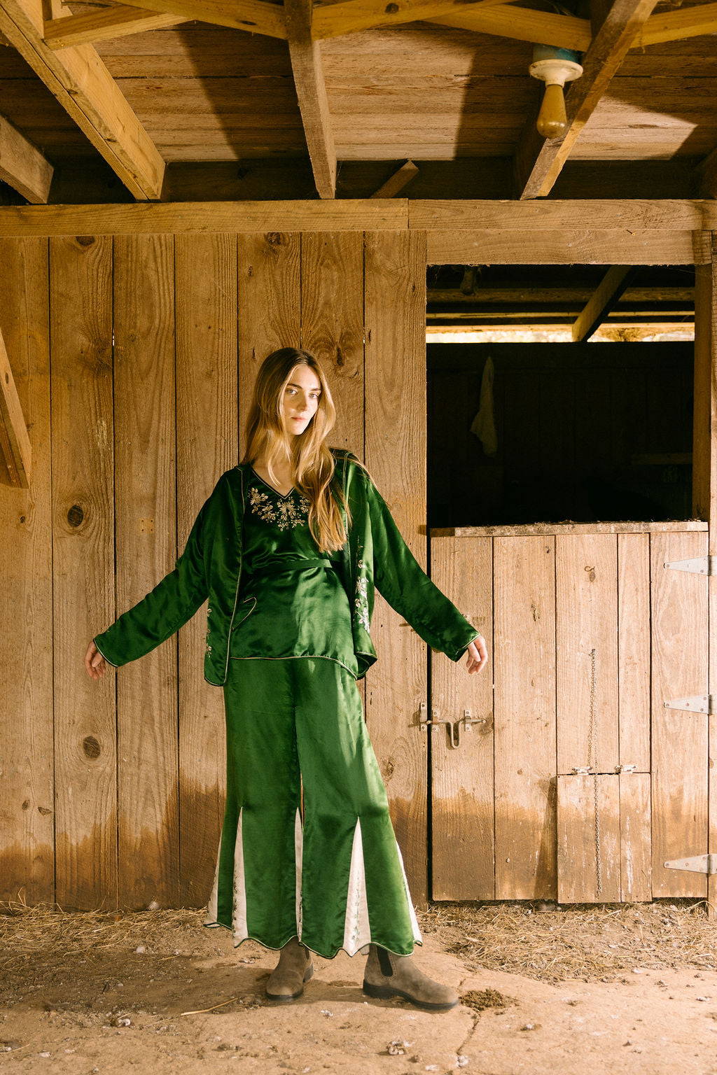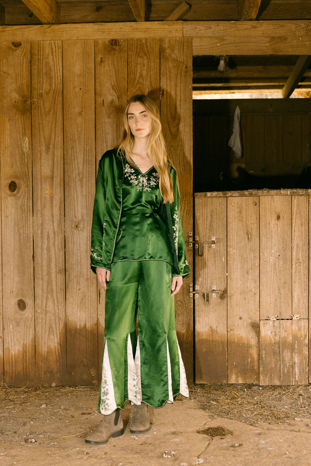 RARE c. 1920s  PJ set in a sought after emerald green silk. Chinoiserie inspired / Asian origin. Pants, blouse, belt, and jacket. Green with ivory embroidery. Pants flare and have an elastic waist which we added.