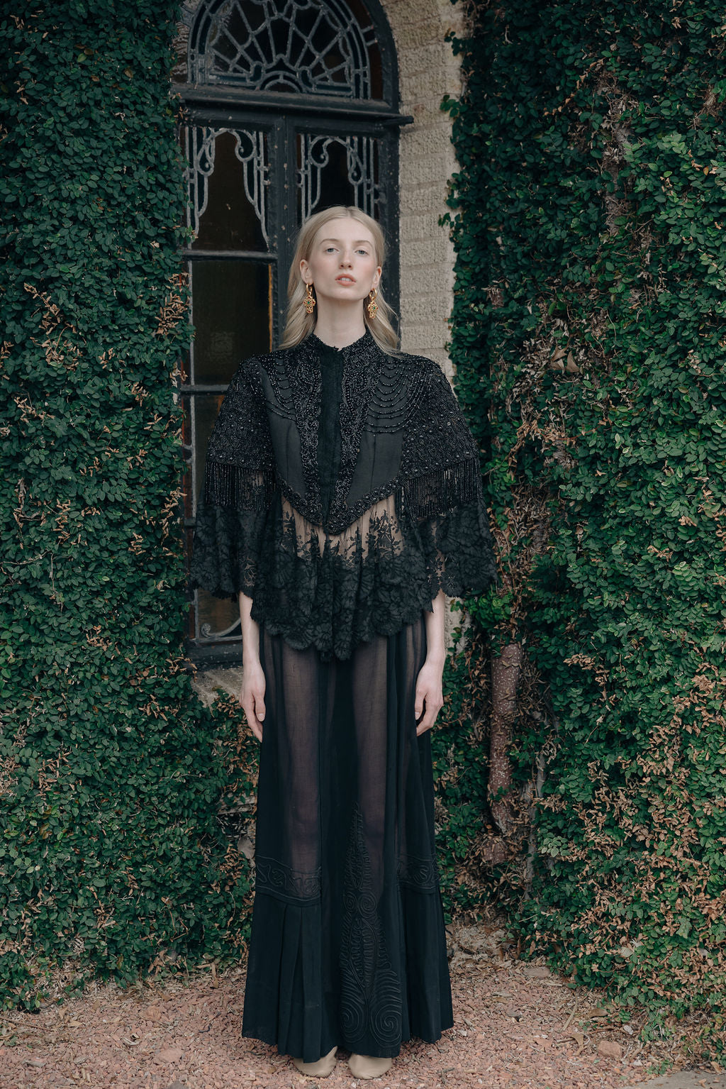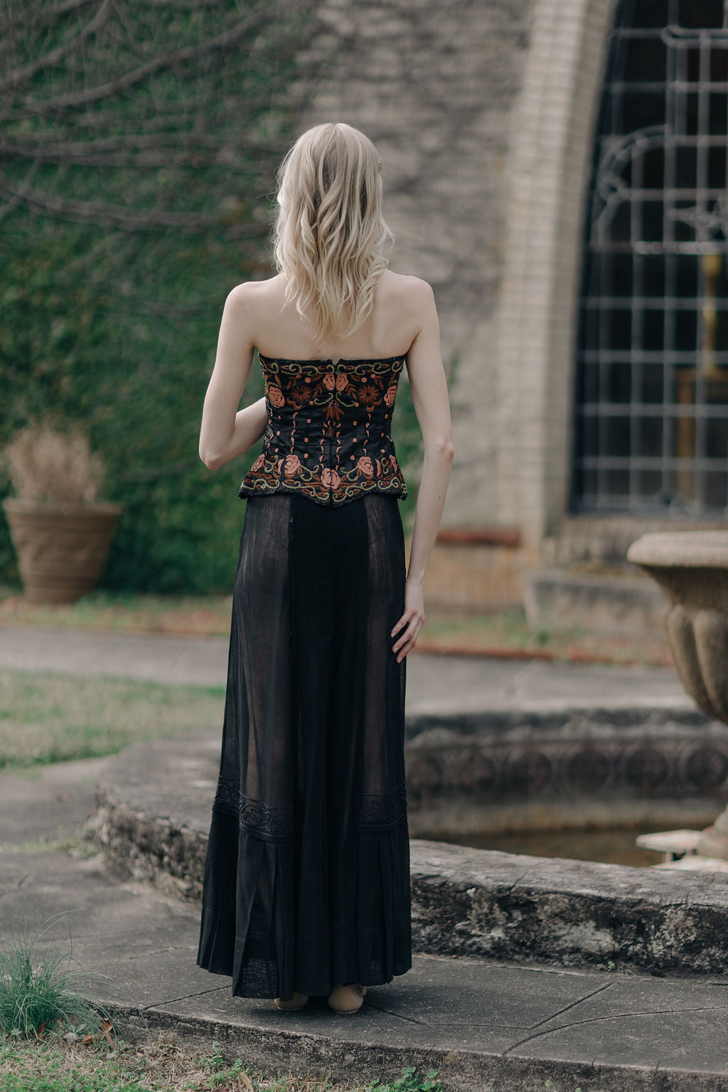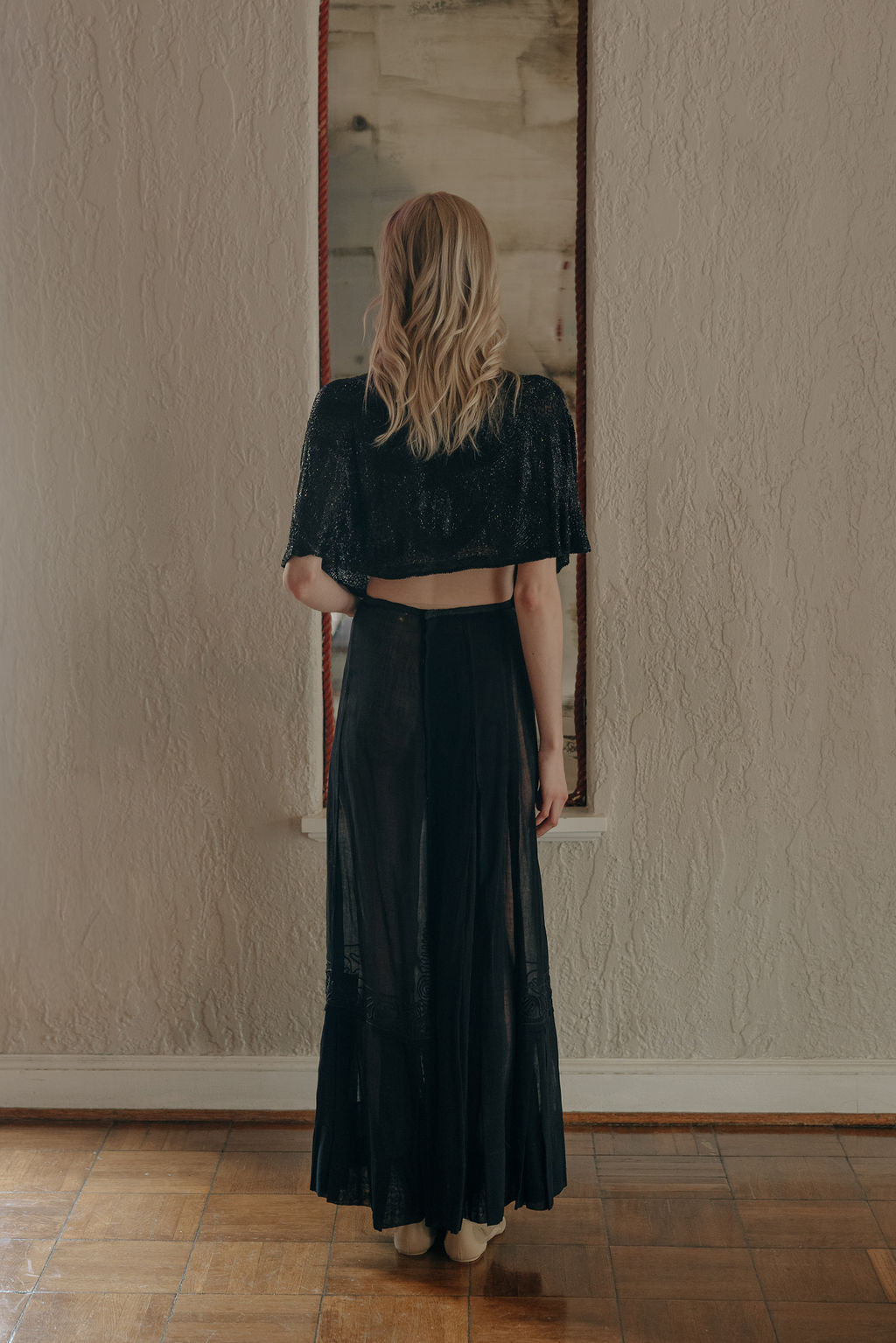 Antique 1900s edwardian semi sheer black gauze soutache skirt. Hook closure at back.