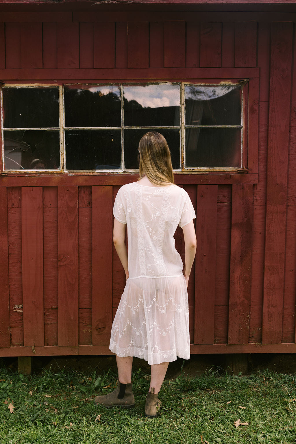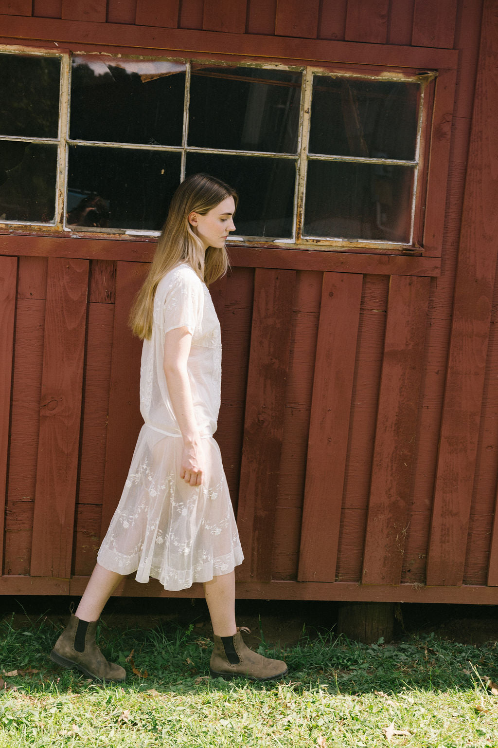 C. 1920s ivory embroidered net tea dress with filet lace panels. slips over head.
