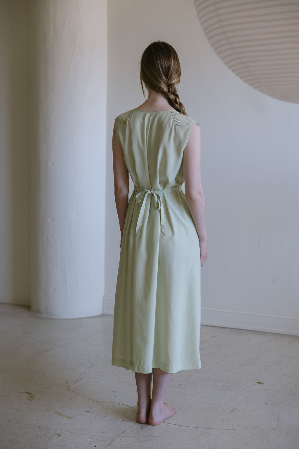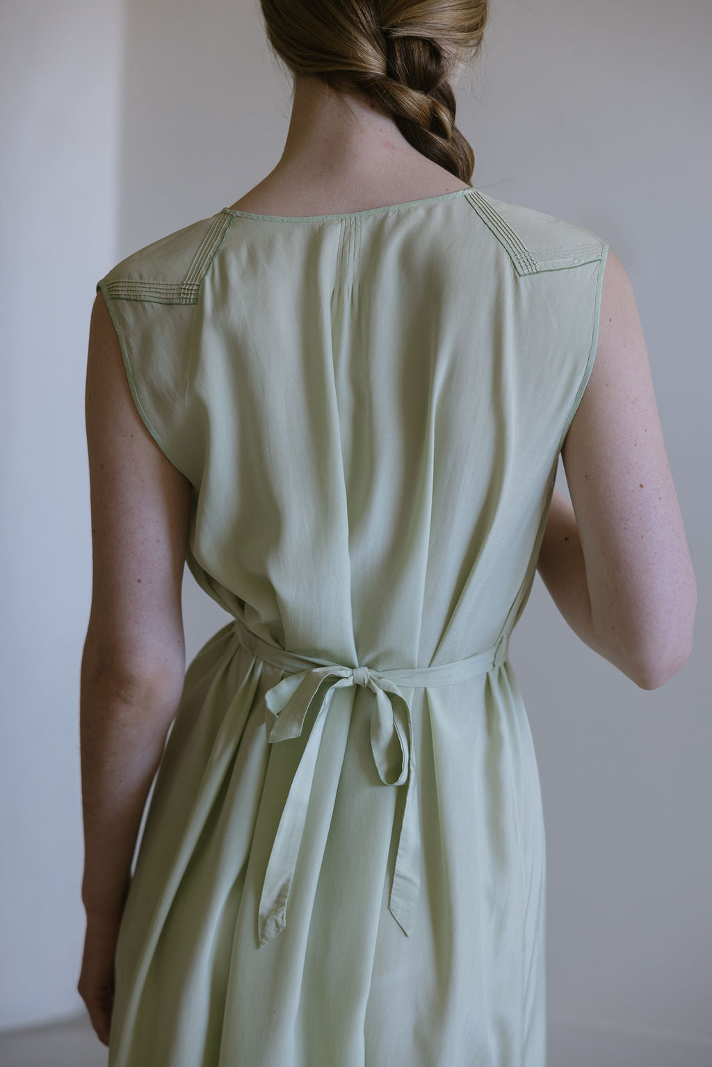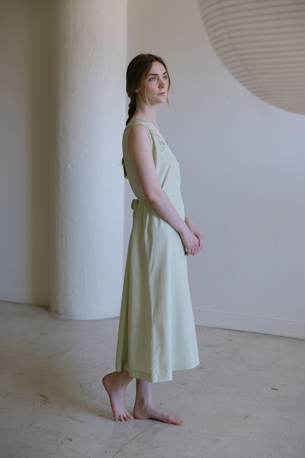 A rare apple green silk dress from france c. 1920s. floral silk embroidery with front monogram and self belt.