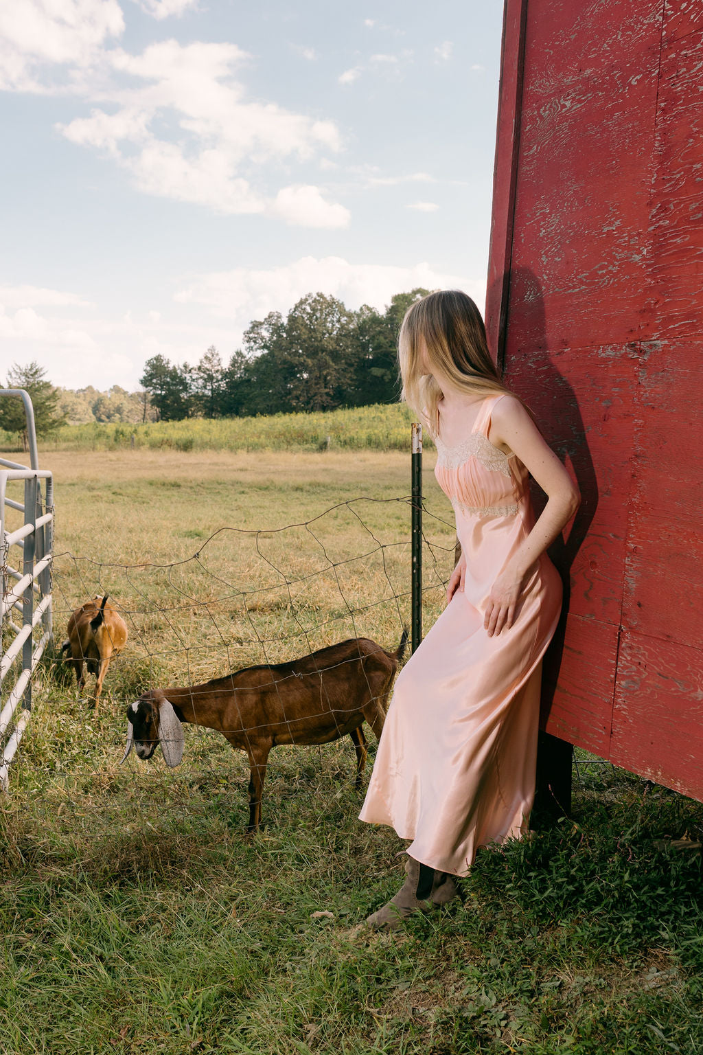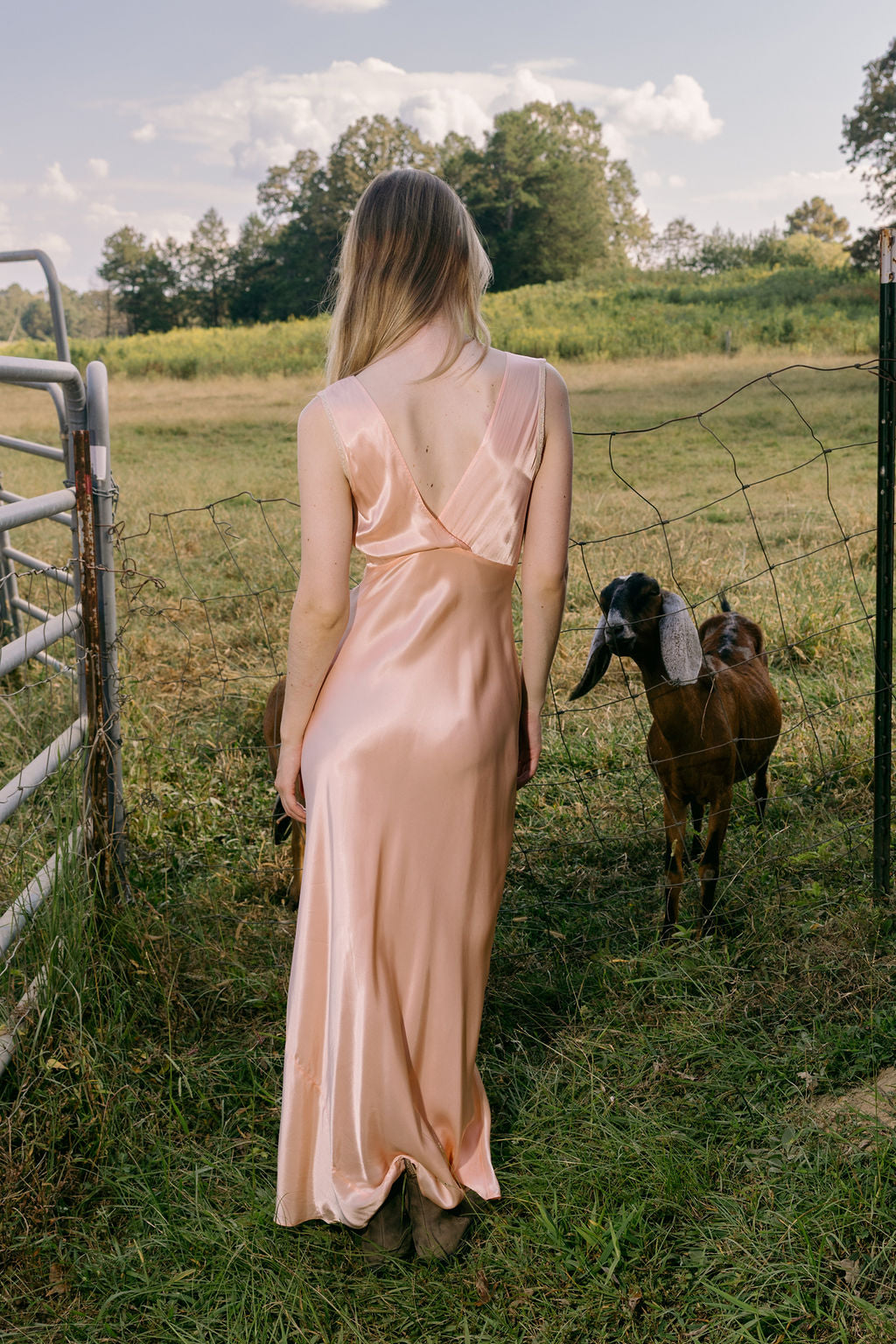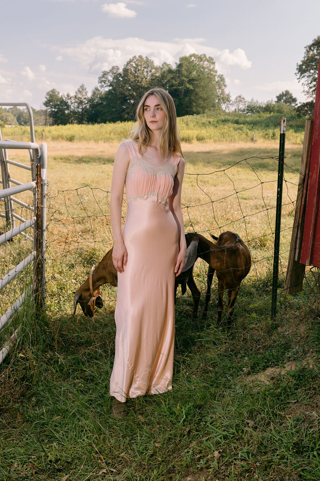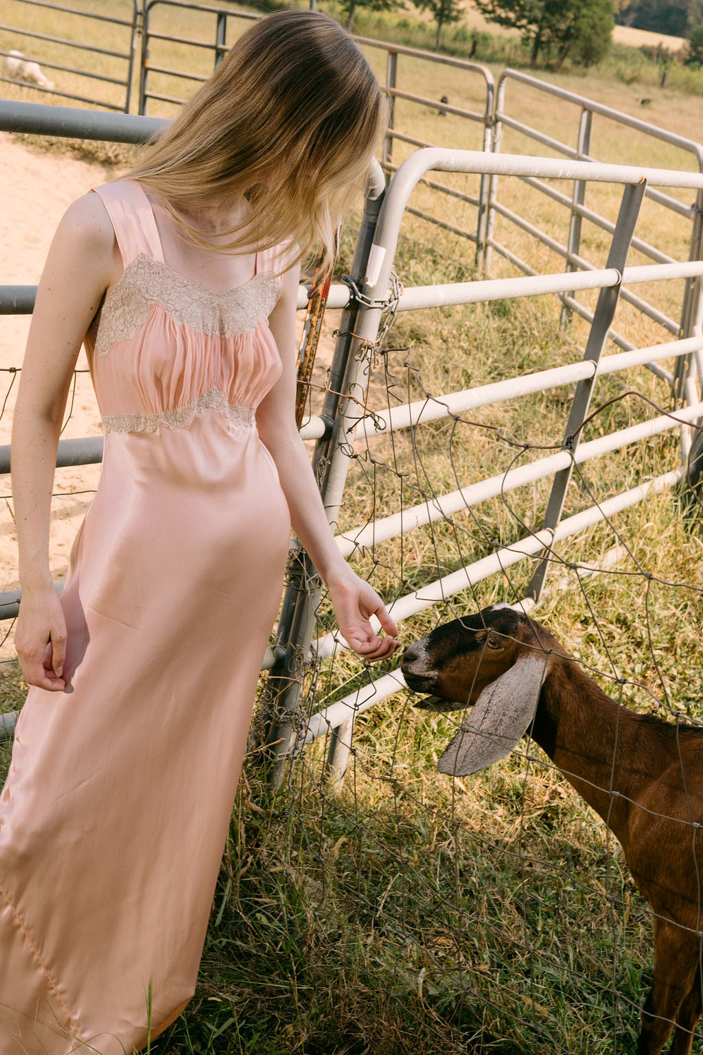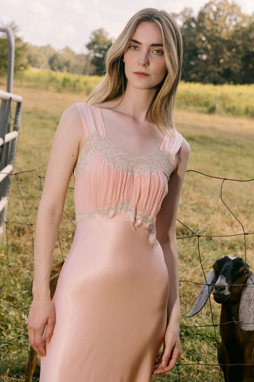 1930s bias nightgown with satin skirt and silk chiffon bust with lace detailing.