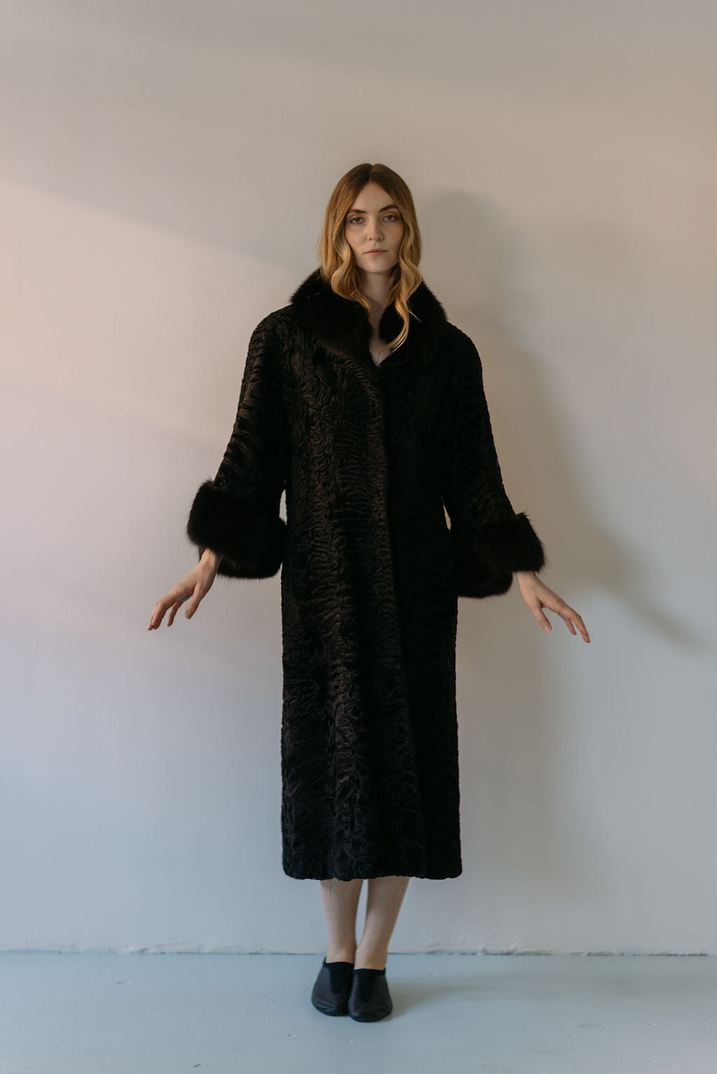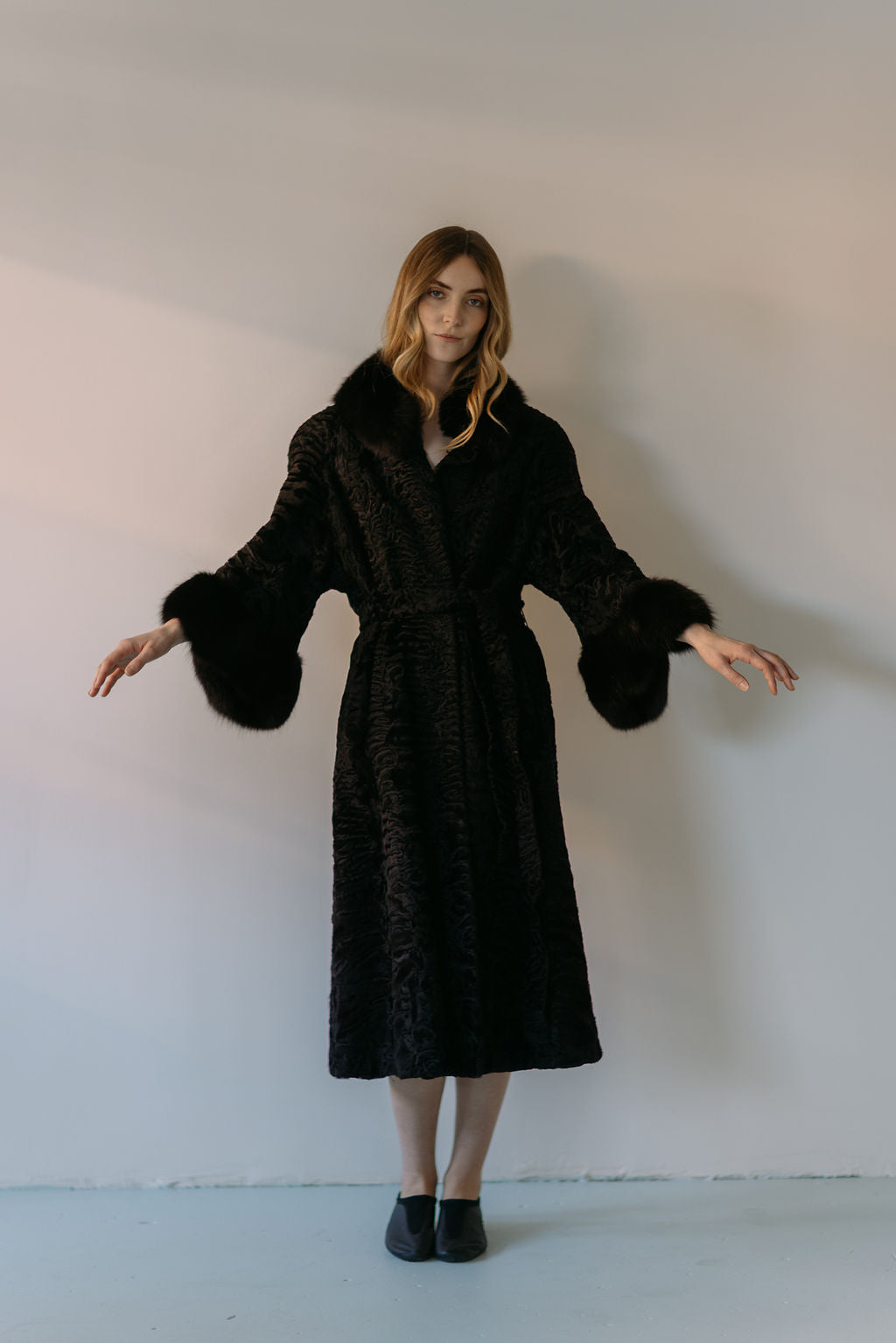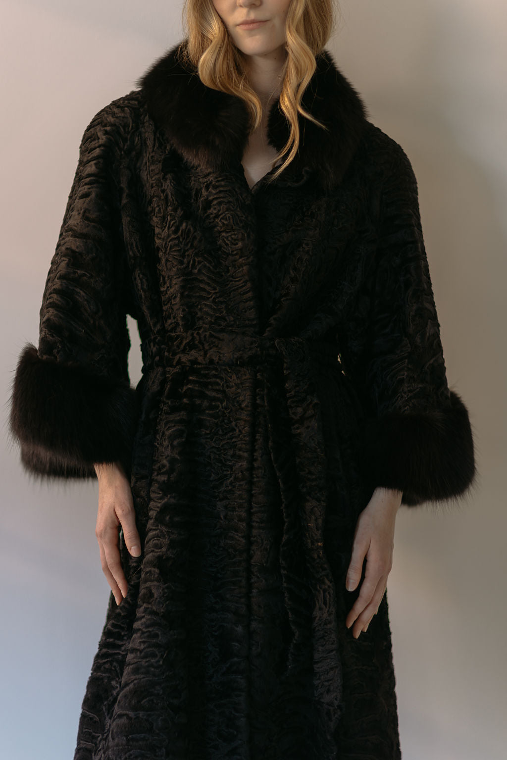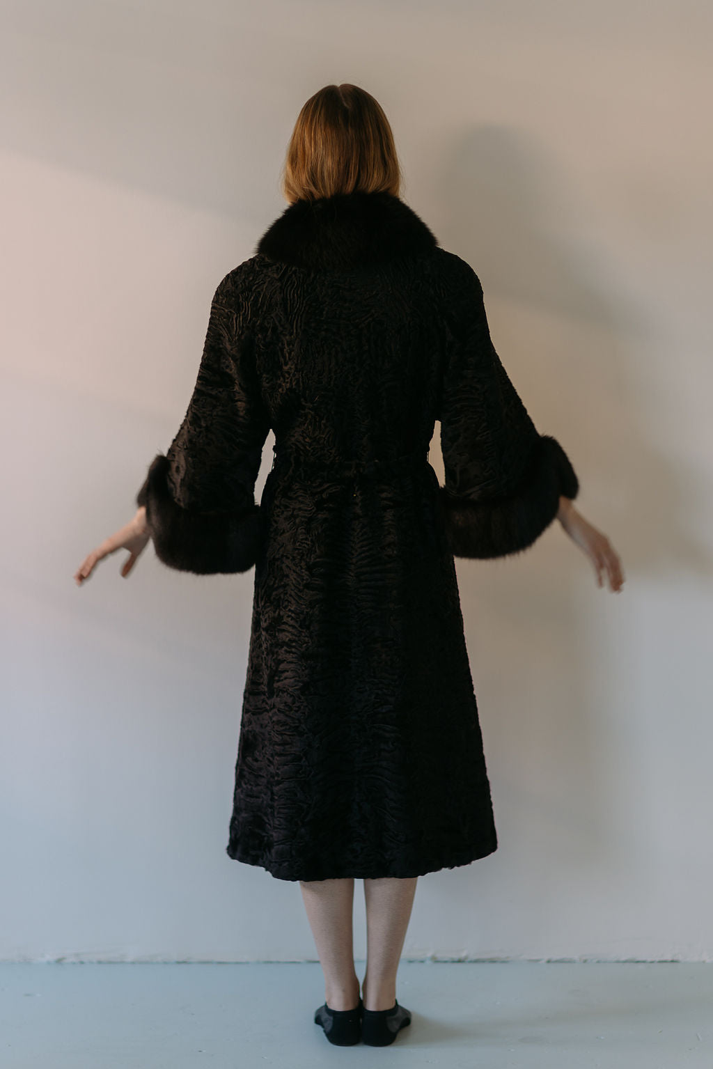 A rare inky black lamb fur coat with black fox fur cuffs. Lined in a silk floral. Made in Germany. late 1950s early 1960s. Please note the sash belt in some of the photos is not included, it goes with the other lamb coat. If you would like one made for this coat, please send us an email and our house seamstress can make a matching one.