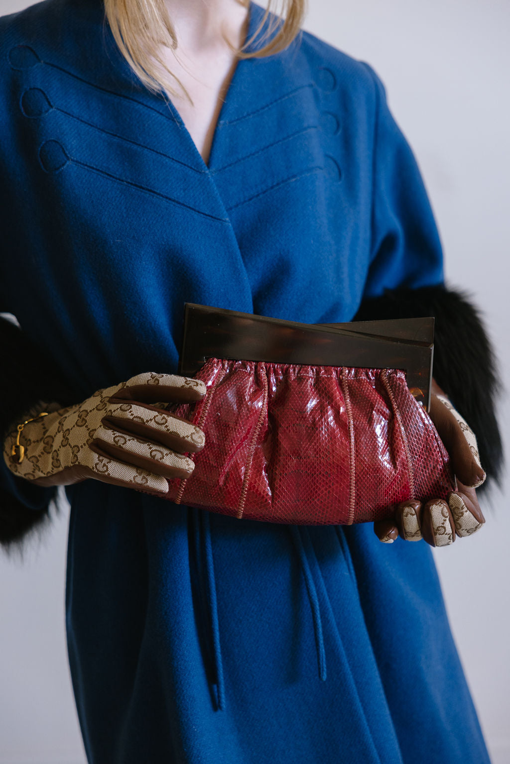 1960s. bakelite and lizard skin clutch. burgundy lizard skin.