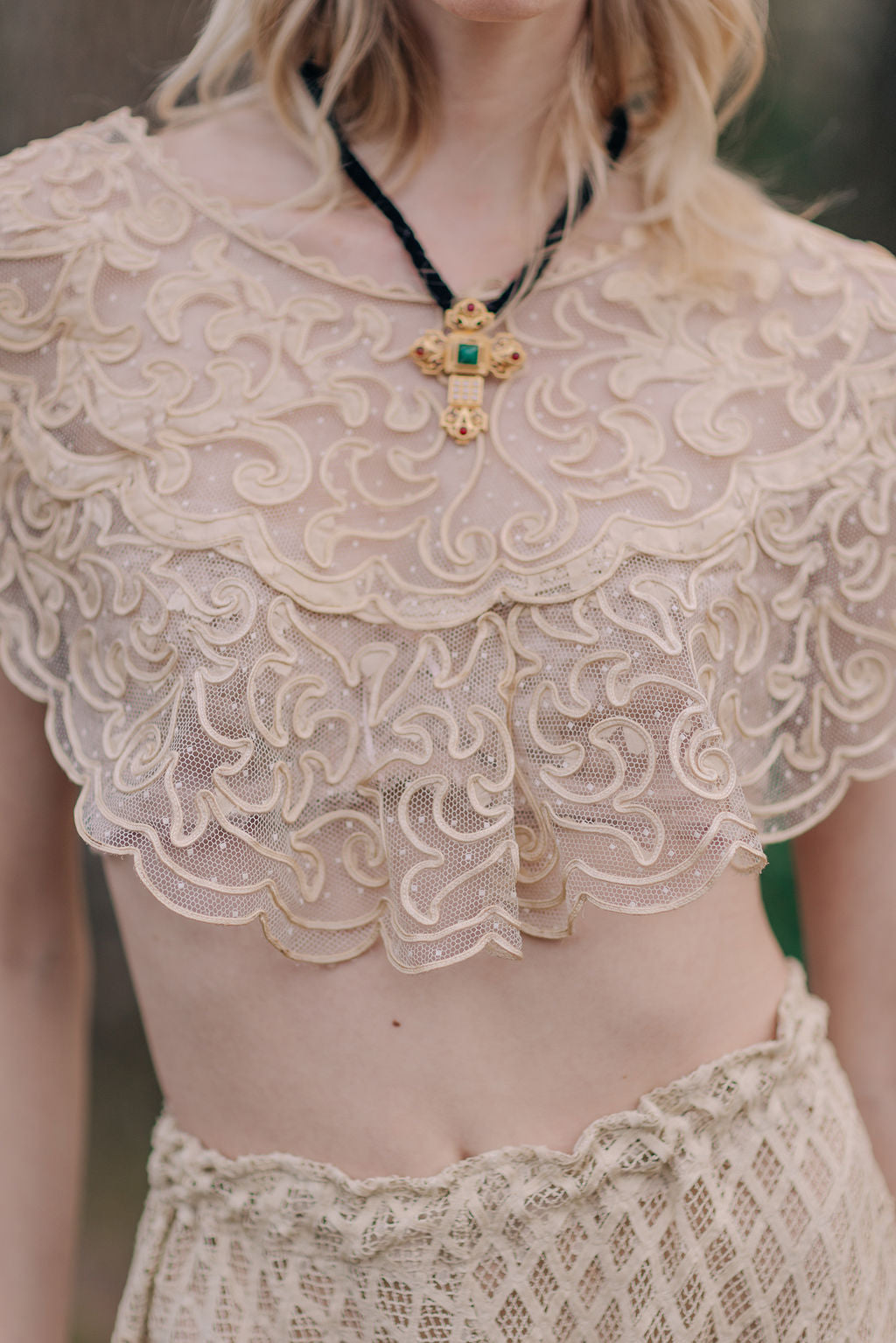 Cream collar made of silk taffeta with corded appliqué on tulle. 1900s. Can be worn with a bra as shown or over a blouse.